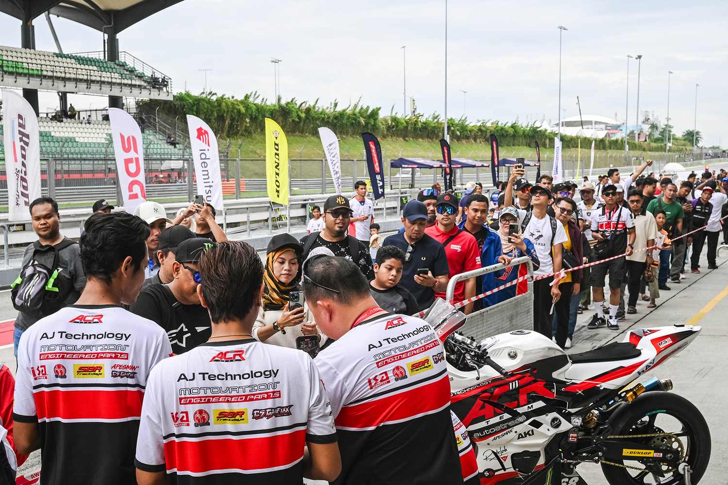 The Pit Lane Walk offers direct fan interaction, showcasing sponsors through Fans engage with Jazil and the crew, highlighting sponsor logos on gear and bikes.